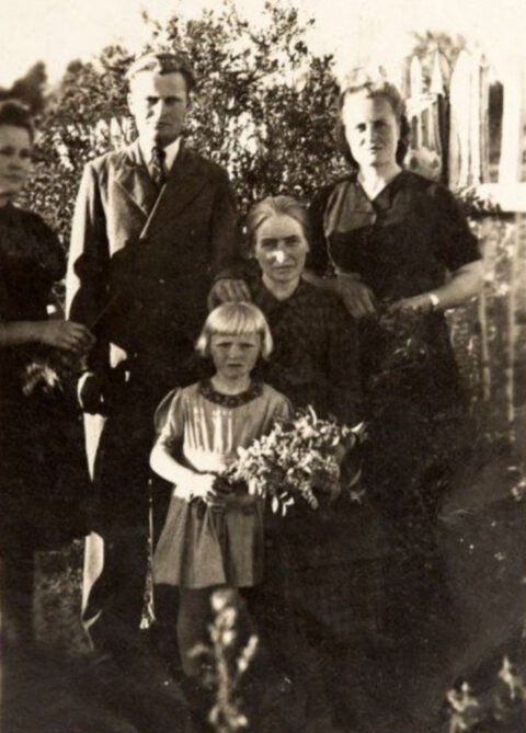 Mała Teresa Sobol (z kwiatami) z mamą, ojcem i krewnymi