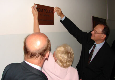 Zawieszenie tablicy „Dom Polski w Iwieńcu im. Andrzeja Stelmachowskiego” przez Marszałka Macieja Płażyńskiego, prezesa Stowarzyszenia „Wspólnota Polska”, Teresy Sobol, Prezes Oddziału ZPB w Iwieńcu oraz Ambasadora RP w Mińsku Henryka Litwina, 05.09.2009 r.