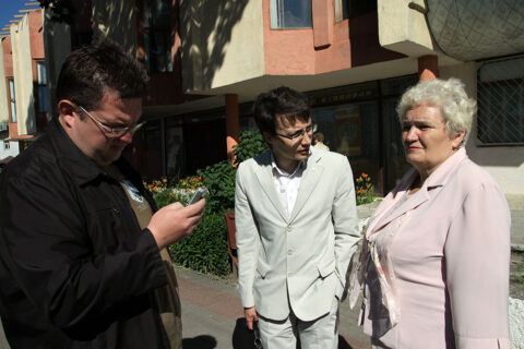 Przed przesłuchaniem: Teresa Sobol z adwokatem i Andrzej Poczobut. Iwieniec 28.06.1010 r.