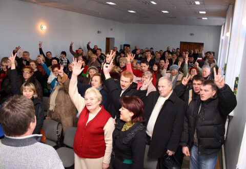 Działaczki ZPB bronią Domu Polskiego w Iwieńcu przed wtargnięciem OMON-u, 08.02.2010 r.