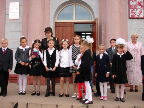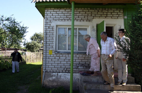 Zawieszenie tablicy „Dom Polski w Iwieńcu im. Andrzeja Stelmachowskiego” przez Marszałka Macieja Płażyńskiego, prezesa Stowarzyszenia „Wspólnota Polska”, Teresy Sobol, Prezes Oddziału ZPB w Iwieńcu oraz Ambasadora RP w Mińsku Henryka Litwina, 05.09.2009 r.