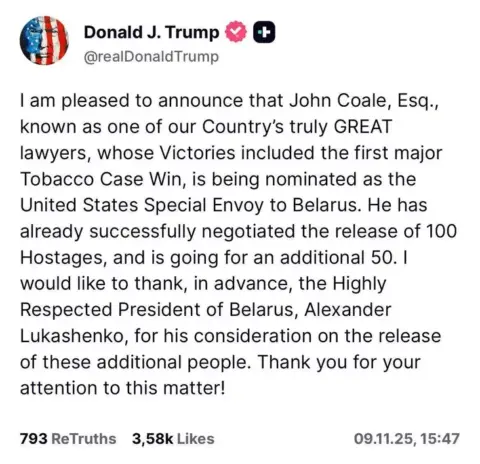 Prezydent Stanów Zjednoczonych Donald Trump poinformował, że John Coale – znany amerykański prawnik – zostanie mianowany specjalnym wysłannikiem USA ds. Białorusi. W opublikowanym wpisie w sieci społecznościowej Truth Social Trump podkreślił, że Coale odegrał już kluczową rolę w uwolnieniu 100 zakładników i obecnie prowadzi negocjacje w sprawie kolejnych 50 osób.