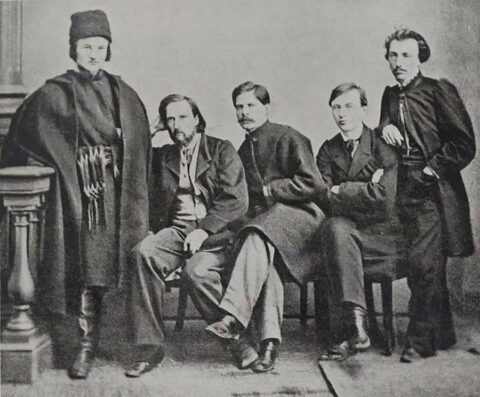 Pięciu przyrodników w Kijowie. Od lewej strony: Konstanty Malewski, Benedykt Dybowski, Aleksander Czekanowski (zesłaniec, badacz Syberji), Konstanty Jelski (podróżnik po Ameryce płd.), Konstanty Kamiński. Fotografia z czasów pobytu B. Dybowskiego jako delegata Rządu Narodowego, rcin.org.pl