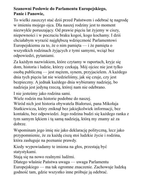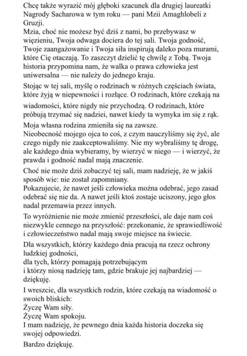 Jak już pisaliśmy, dzisiaj Jana Poczobut – córka więzionego na Białorusi dziennikarza Andrzeja Poczobuta – wystąpiła w Parlamencie Europejskim podczas uroczystości wręczenia Nagrody im. Sacharowa. Jej przemówienie, pełne emocji i wdzięczności, stało się symbolem walki o wolność słowa oraz solidarności z rodzinami więźniów politycznych.
