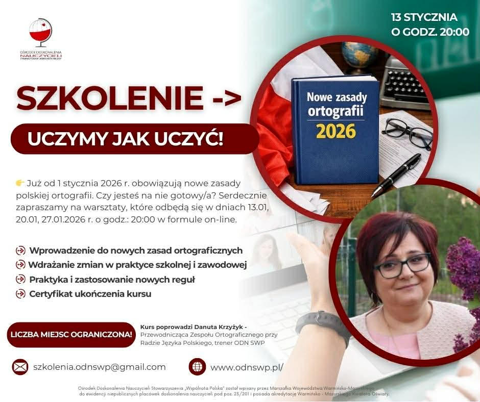 Od stycznia 2026 r. zaczął obowiązywać zaktualizowany zestaw zasad polskiej ortografii. Ośrodek Doskonalenia Nauczycieli Stowarzyszenia „Wspólnota Polska” (ODN SWP) zaprasza na trzy praktyczne szkolenia online, które pomogą przygotować się do zmian i wdrożyć je w codziennej pracy z tekstem.