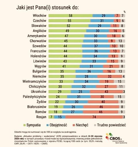 Z opublikowanego przez CBOS raportu wynika, że w 2026 roku Polacy najczęściej deklarują sympatię wobec Włochów, Czechów i Słowaków. Włosi pozostają liderami zestawienia, budząc pozytywne emocje u 58 procent badanych, a negatywne jedynie u 7 procent. Pozytywnie oceniani są także Anglicy, Amerykanie, Litwini i Węgrzy. Jednocześnie trzeci rok z rzędu pogarsza się stosunek Polaków do narodów, które zyskały w ich oczach tuż po wybuchu wojny w Ukrainie — m.in. do Amerykanów, Anglików i Ukraińców. Największą niechęć Polacy deklarują wobec Rosjan, których negatywnie ocenia aż 74 procent respondentów. Na drugim miejscu znajdują się ex aequo Białorusini i Romowie, wobec których niechęć wyraża po 46 procent ankietowanych. Sympatię wobec Białorusinów deklaruje jedynie 19 procent badanych, co potwierdzają również omówienia sondażu w PAP i RMF24 .