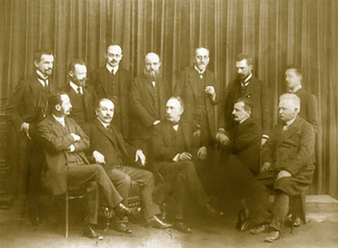 Członkowie Polskiego Towarzystwa Przyrodników im. Kopernika na przełomie XIX i XX wieku. Maksymilian Tytus Huber (ur. 4 I 1872 w Krościenku nad Dunajcem, zm. 9 XII 1950 w Krakowie) – naukowiec, inżynier mechanik; Stanisław Tołłoczko (ur. 22 VIII 1868 w Czelejowie koło Brześcia, zm. 5 III 1935 we Lwowie) – chemik, profesor (prezes PTP im. Kopernika 1913); Marian Smoluchowski (Marian Ritter von Smolan Smoluchowski, ur. 28 V 1872, zm. 5 IX 1917) – fizyk, pionier fizyki statystycznej, alpinista i taternik (prezes PTP im. Kopernika 1906–1907); Stanisław Sokołowski senior (ur. 19 X 1865 w Młoszowej koło Chrzanowa, zm. 31 VIII 1942 w Zakopanem) – pionier polskiego leśnictwa, rzecznik utworzenia Tatrzańskiego Parku Narodowego (prezes PTP im. Kopernika 1912, 1914–1917); Eugeniusz Mikołaj Romer (ur. 3 II 1871 we Lwowie, zm. 28 I 1954 w Krakowie) – geograf, kartograf i geopolityk, twórca nowoczesnej kartografii polskiej, współzałożyciel wyd. Książnica–Atlas brat Jana, ojciec Witolda i Edmunda (prezes PTP im. Kopernika 1910–1911);  Stanisław Opolski (1876–1918) – profesor chemii (sekretarz PTP im. Kopernika 1912–1913);  Henryk Karol Klemens Kadyi (ur. 23 V 1851 w Przemyślu, zm. 25 X 1912 we Lwowie) – profesor anatomii opisowej oraz patologii (prezes PTP im. Kopernika 1894–1895). Fot.: pauza.krakow.pl
