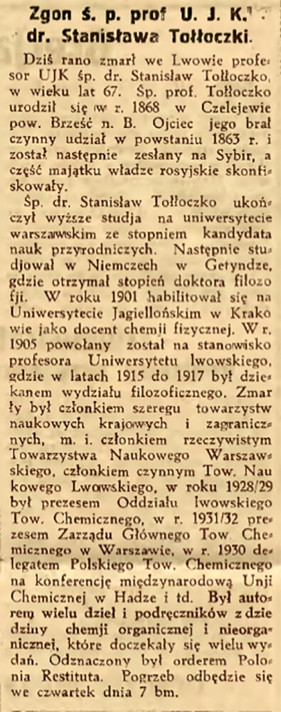 5 marca przypada rocznica śmierci Stanisława Tołłoczki, jednego z najwybitniejszych polskich chemików przełomu XIX i XX wieku, profesora Uniwersytetu Jana Kazimierza we Lwowie i badacza, który znacząco przyczynił się do rozwoju chemii fizycznej oraz edukacji chemicznej w Polsce.